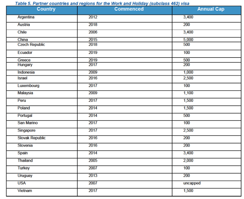 这就跟上面417签证差别有点大,462类别主要还是发展中国家,只有几个少数发达国家。除了美国外,基本都要求要大学毕业,提供语言成绩,这就卡死了很多人,所以太年轻的基本都申请不了。