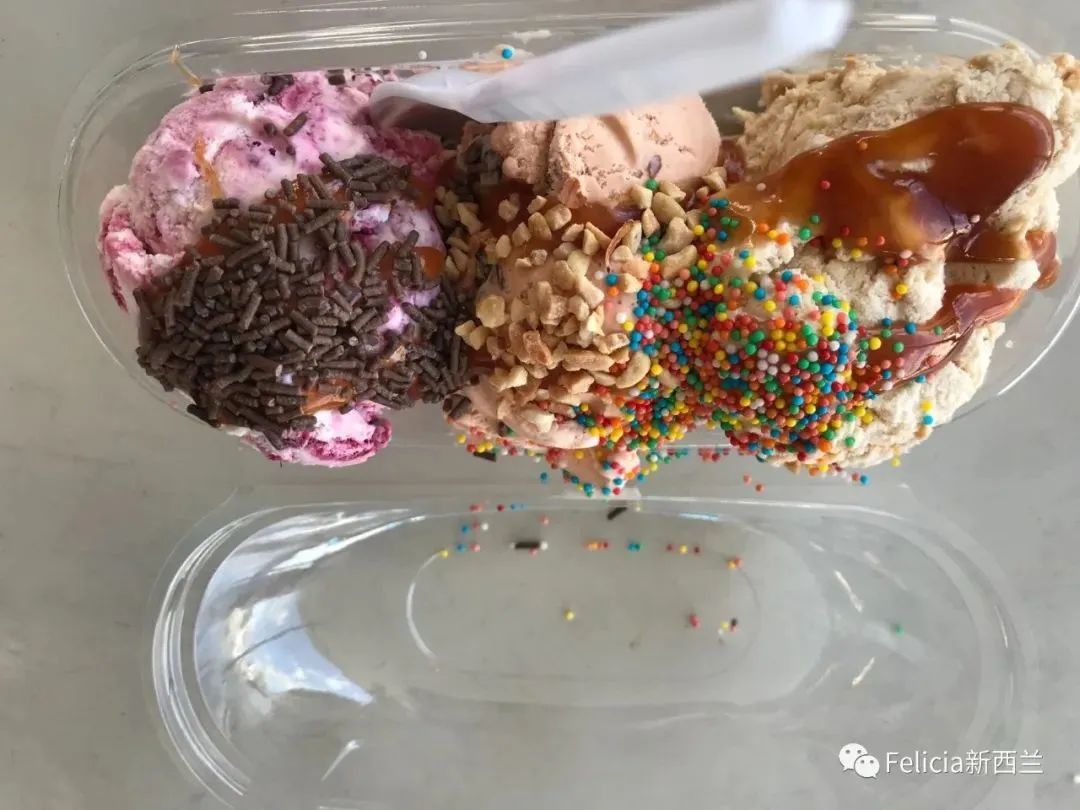 来到新西兰之后冰淇淋是绝对要试一试的食物,tiptop冰淇淋十分出名,然而,在mission bay的一条街上,有很多牌子的冰淇淋 ,包括tiptop,ben&jerry等等,其他门店的顾客寥寥几人,只有一个牌子的冰淇淋店门口排着好几条长长的队伍,那就是瑞士的Mövenpick,里面的雪糕真的琳琅满目,在各种颜色和口味的冰淇淋中我选了Dutch choc,rapsberry cheese 还有 maple walnut三种口味的三球冰淇淋,其中我最喜欢rapsberry cheese(树莓芝士味道),建议朋友可以试试如果有机会碰到的话。后来才知道原来在国内Mövenpick叫梦龙哈哈,不过还是得试试这样子的雪糕才行。