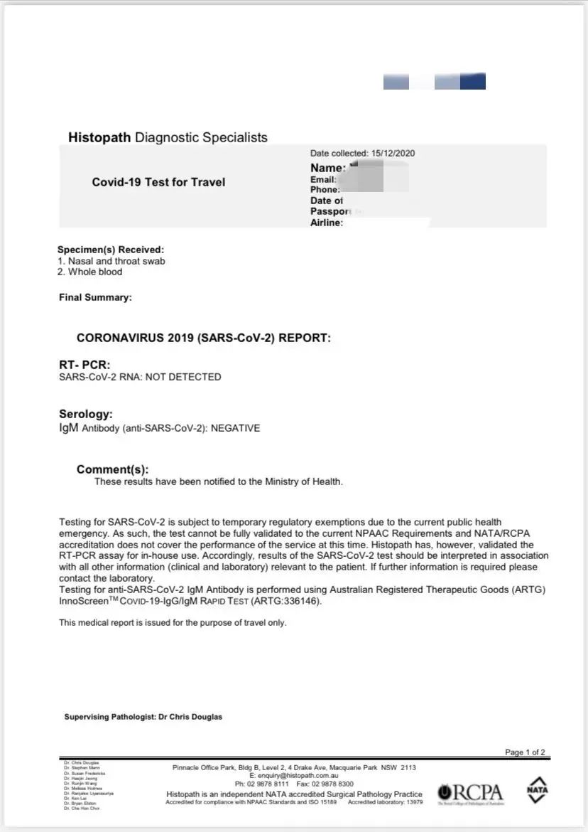 经历了九小时的飞行和一系列过关斩将,我终于回到北半球开始为期14天的酒店隔离生活。趁着有时间,我来记录一下整个回国的过程。近期有计划回国的小伙伴可以参考。 核酸及IgM血清抗体检测 现在回国最重要的就是这两项检测。官方要求登机前48小时内必须上传检测报告得到绿码,这个绿码就是登机的通行证。例如我是12月17日中午12点的飞机,就必须在15号完成两项检测。至于时间,并没有卡到一定要在12点过后,只要在15日当天内完成检测即可。切记不要提前做,万一报告出来超过了两天,这份报告就相当于失效了。 关于检测点的选择,目前市面上大家去的比较多有三家:康平、4Cyte、Histopath。我选的是Histopath。没别的原因,它是最便宜的一家,核酸+血清检测只要120刀(确切来说,它家核酸是免费的,只收取血清检测的费用)。康平是华人诊所,价格240刀,直接被我排除了。4Cyte是公认出报告速度最快的一家,180刀。 4Cyte可以网上提前填资料付款的,而Histopath不接受预约,当天直接去检测点检测付费就可以了。我当时比较纠结,因为不接受预约意味着存在未知,万一当天去的人太多排不上号就惨了,但是翻遍小红书也没看到有人遇到这种情况,最后决定冒个险,毕竟60刀可以省下来买买买呢。 4Cyte和Histopath都写着drive through clinic,就是像得来速一样开车进去后不用下车,直接在车内采样就可以了。没车一族也不用担心,两家我都发邮件过去问了,得到的答复都是可以walk in检测的。 接下来就重点介绍Histopath了。他们家有很多个检测点,贴一个官网网址,可以自行选择离自己近的地方。 https://www.histopath.com.au *信息截自官网 好像大部分人都选择去机场那家,导致有时候需要排比较久的队。我选的是Brighton-Le-Sands的检测点,当天10点左右去,就只有我一个人。工作人员大叔特别耐心亲切,确认我是两天后的飞机后就拿了个宣传单子让我扫码填资料。那天下着雨,他从里头拿了把伞,站在我旁边帮我撑伞让我填信息,跟我说不要急慢慢来。 记得提前备好护照号航班号以及银行卡信息,因为扫码过后要是想退出界面查信息再点进去的话就得重头填写。 提交资料后会生成一个reference number,截图下来出示给采样人员。先是用棉签在喉咙处擦拭取样,然后再拿一根长长的棉签伸进鼻子取样,两个鼻孔都会取,感觉很酸,就想象游泳时被水呛到的感觉,但是速度非常快,不算特别难受。血清检测就比较容易了,在手指头上扎一下抽个血就行了。全程速度很快,工作人员也都非常nice。大叔和我说如果有facebook群组的话让我帮忙推荐一下这里,不要再去机场那边了,最近机场那边经常排队,需要做一些分流。 工作人员说报告在24小时之内会出来,如果没有收到的话可以打宣传单上的电话询问。我早上10点做的检测,下午5点半左右就收到报告了。所以结合价格和出报告的速度,Histopath都作为首选推荐! 检测点在一个公园里面,一个小小的集装箱,取样就在集装箱外面完成。如果是坐地铁来的话,出了地铁站后需要再走十来分钟。Google以下地址即可。 另外贴一下机场的地址fyi。 最后出来的报告长这样。 拿到报告后就微信搜索“防疫健康码国际版”小程序,填写个人信息并上传报告。这份报告是核酸和血清一起的,同一份报告上传两次就行。提交后就是等待审核了。我大约是在当天晚上9点左右收到了绿码,一切都挺顺利的。 登机准备 我乘坐的是厦门航空,可能其他航空公司和各地入境操作会有些许不同,仅供参考哈。 都说国际航班至少提前三小时到机场,我12:05的飞机,8:15到的时候已经大排长龙了。据说有人早上7点来的时候就已经在排队了。所以最好早一点到,尤其是需要退税的朋友们,尽量给自己多预留一点时间,这个时候每个航班回国的人都很多! 排队期间工作人员会分发一张单子,上面有两个码需要扫描填信息。check in前工作人员会查看绿码。等拿到登机牌后知道了自己的座位号就可以填写两个二维码的信息了。 过安检排队的时候,提前把包里的充电宝、手提电脑以及电子设备都先拿出来另外放,保温杯里有水的话也都倒掉。提前做好可以省一些时间,不至于到你的时候手忙脚乱的。 过完安检后有个免税区,有时间的话可以看看。有些大牌护肤品挺划算的。但是像保健品这一类的就不建议在机场买了,比chemist warehouse的贵很多。 记得在登机前填写好海关指尖服务的信息,得到下面这个健康申报码,登机前出示给工作人员看。我一开始以为出示的是绿码,工作人员说要的是红色的健康申报码,我才急急忙忙填写资料,耽误了些时间。所以请务必在登机前完成上面两个码的扫描填写工作。 飞机上基本是座无虚席的。口罩全程戴好,我看到有两三个穿防护服的乘客,直呼牛逼。座位上每人发了一袋食物,里面是些小零食和水,期间乘务员就不会像平时那样提供餐车服务了。其实九小时看看电影睡两觉挺快就度过了。 每个座位前面都有一张重点人员移交记录单,需要在下飞机之前填好,记得随身带支笔哦各位。填到第7点即可,酒店名称及地址不知道的话可以不填。在华居住地就填自家地址,精确到门牌号。 落地事宜 飞机落地后在飞机内等待指示再下飞机。下飞机后就是到核酸检测点了,在那之前在柜台递交护照给工作人员,并刷一下前面登机时候出示的健康申报码。工作人员会给你一个贴纸。 准备好飞
