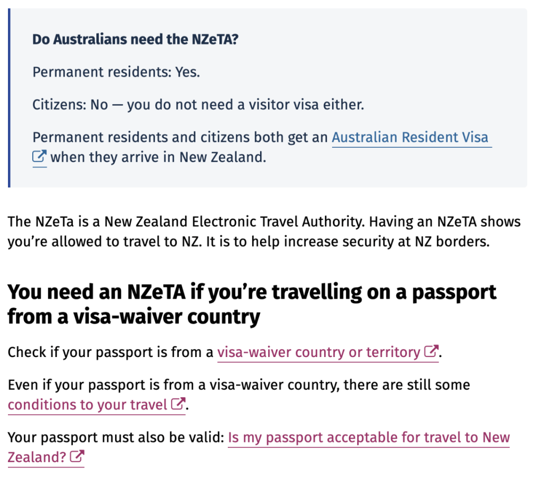 例如,身处澳洲的人去新西兰,如果是澳洲公民,可以直接去新西兰,PR则是完成NAeTA,其他人申请签证(访客签证/学签等等,这个其他人不就是我们苦逼的WHVer吗…),而其中一部分国家的人去新西兰不需要申请签证,只需要完成NZeTA,有个清单,很遗憾,中国大陆不包括在内(港澳台都齐了,就是没有内地)…