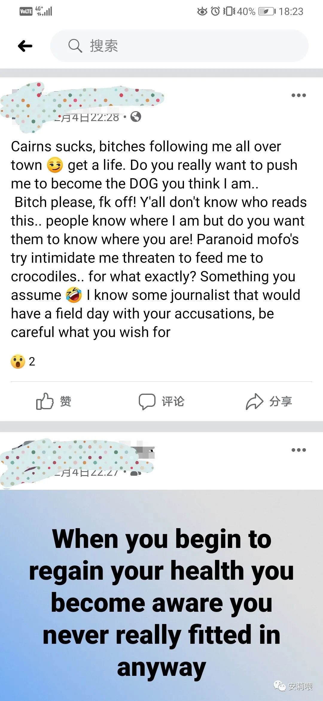 直到我走的那天,我都没有真正见识到他所谓的仇家和毒贩,青旅和凯恩斯一直都很平静,充满peace and love,所以我越来越觉得他一直在自导自演,加上后面他的FB持续在发他被各种人威胁和挑衅的时候,我甚至觉得他是有点被害妄想。