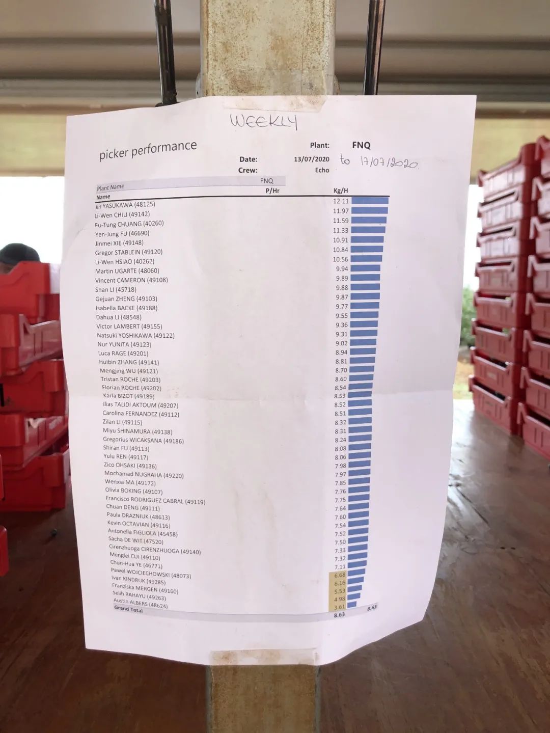 六一儿童节,也是我在Costa采蓝莓的第一天,我们来的时候正是蓝莓的爆果期,因此他们同时招了不少人。我们这些同一天induction的人成立了新的一个组,叫Echo.那时候,疫情爆发才半年左右,所以我们组还有不少新手,而以计件来结算工资的蓝莓价格听说是根据这一组的平均水平来决定的——以确保慢手赚的钱不会太难看。
