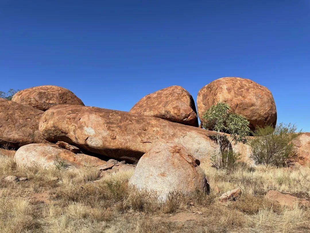 车子开出town不久,便少有人迹。广袤的澳大利亚腹地,红土与枯草,矮矮的灌木丛,在开阔的视野中沉默着,又似诉说着某种无解的苦楚。我们路过Devils Marbles,朋友特地转进景区让我逛逛。