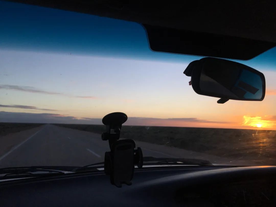 除了加油,我就这样一刻不停从清晨开车到黄昏。太阳慢慢从西北方向落下去,而那时候我们正行驶在这个星球上最大的一块石灰岩基岩上面,这就是大名鼎鼎的 Nullarbor 平原。这块二十万平方公里的旷野横跨南澳和西澳两个州,异常平坦和干旱,几乎没有树木生长。而上面拥有据称世界上最笔直的公路,一路向着笔直的地平线驶去,让人有种置身一个由直线和平面构成的二维世界。