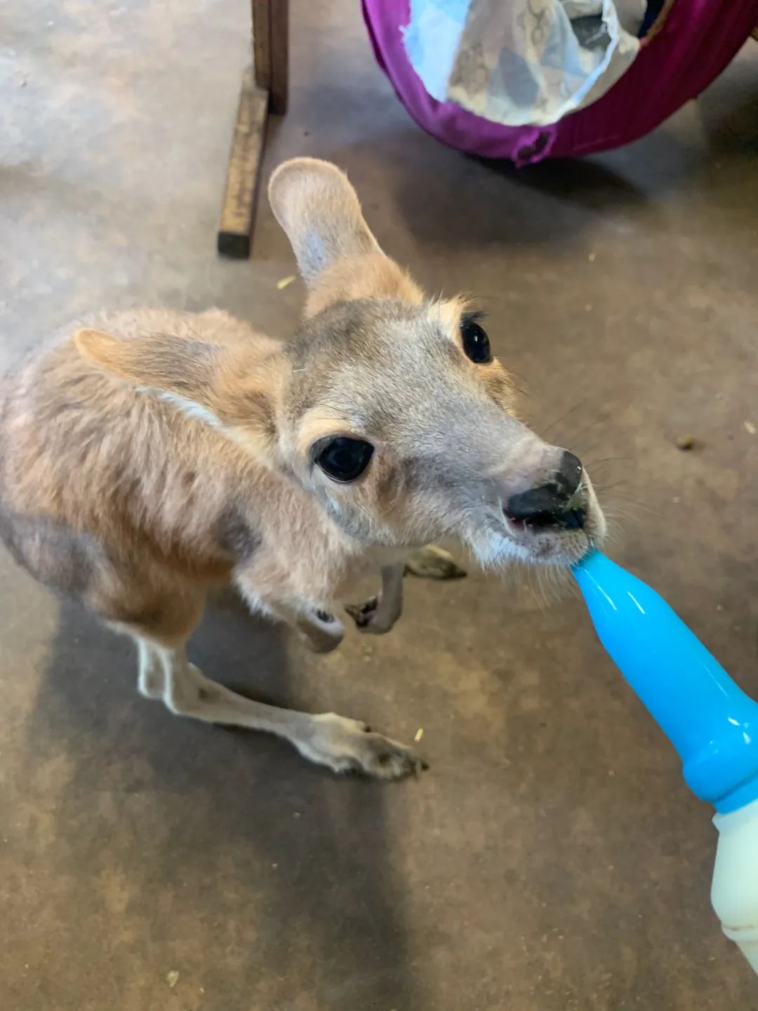 我get到最多袋鼠相关常识的地方是在Kununurra。那里有个远近闻名的袋鼠之家:Kangaroo Haven。如果你初来乍到,当地人一定会给你推荐这个地方。它并不是什么政府公益组织,而是一位名叫Mandy的女士的家。Mandy十多年前在公路上撞到了一只袋鼠,袋鼠当场就断气了,但是Mandy发现它的口袋里还有一只小宝宝。于是就把这只orphaned joey带回了家。为了照顾它,她请教了镇上的兽医,也查阅各种资料,从袋鼠小白晋升成了全镇最有经验的袋鼠专家。 此后,她不断致力于救助袋鼠和其它野生动物。她的家也从一个两居室搬到了几万平米的袋鼠基地。被她救回的袋鼠经过精心的治疗和照料,待痊愈后便放归大自然。许多人会将捡到的袋鼠宝宝送到这里,有时候可能是半夜,救活奄奄一息的小家伙往往是争分夺秒的事情,Mandy便没日没夜寸步不离地守着,这真的不是一件容易的事。她已经帮助600多只袋鼠重回大自然了,而这个数字还在不断增加。 如果你想要来这里参观,提前预约,花上10刀就可以参加一个tour,Mandy会带着你一站式参观讲解。我一共去过两次。第一次去的时候,她正在厨房和几个志愿者准备给袋鼠宝宝喝的奶。看到我们来了,便领我们去她的办公室,里面有两排袋子,每个袋子里都有一只袋鼠宝宝。Mandy会将袋鼠宝宝分配到我们怀里,拿奶瓶给我们喂,并介绍起它们的故事。它们都很乖,完全就是小婴儿。 当时基地里有三只盲袋鼠,它们的眼睛是白色的。Mandy说给袋鼠幼崽喂牛奶就有可能导致这样的后果。这也是为什么前面说到如果在野外看到袋鼠宝宝,不要随便给它们喂吃的,不然很有可能造成终身残疾甚至死亡。Mandy说盲袋鼠会一直留在基地,因为放回自然它们可能无法生存。