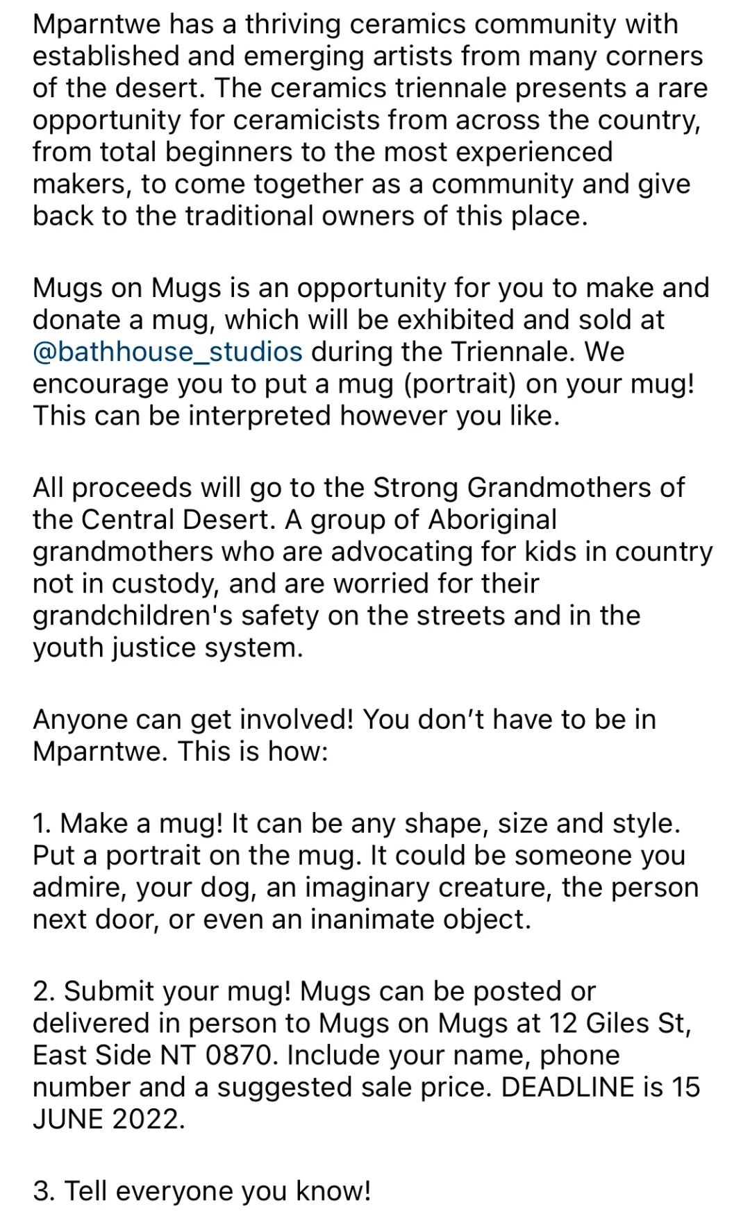 知道这个活动是因为我所在的咖啡店的常客+前manager Mikaela。她目前在CDU学习ceramics的tafe课程,她们班级的老师正在筹备这次筹款展览。于是她分享了这个信息在ins上。