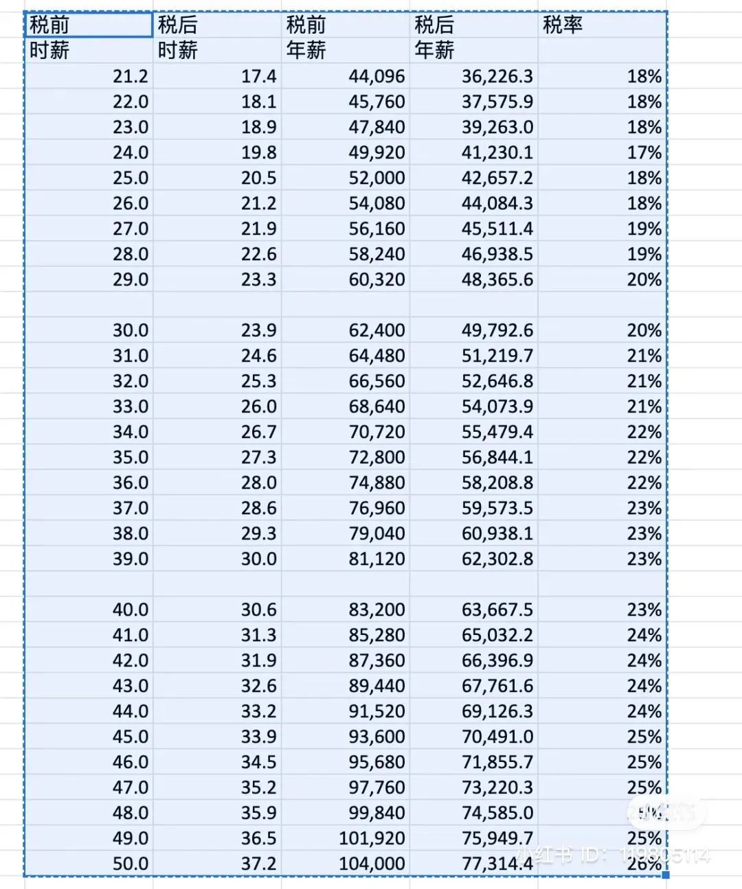 这样的结果是无论做什么工作扣税之后并无太大差别,这里我贴一张时薪与税后收入表格,你会发现数字差距并不大。本地人大多可以凭兴趣选择自己的职业或事业,既然可以凭热爱养活自己,为何要做不喜欢的?正因如此,他们普遍知足、比较满意自己的生活,不去与他人做对比,乐于活在自己的小世界里。