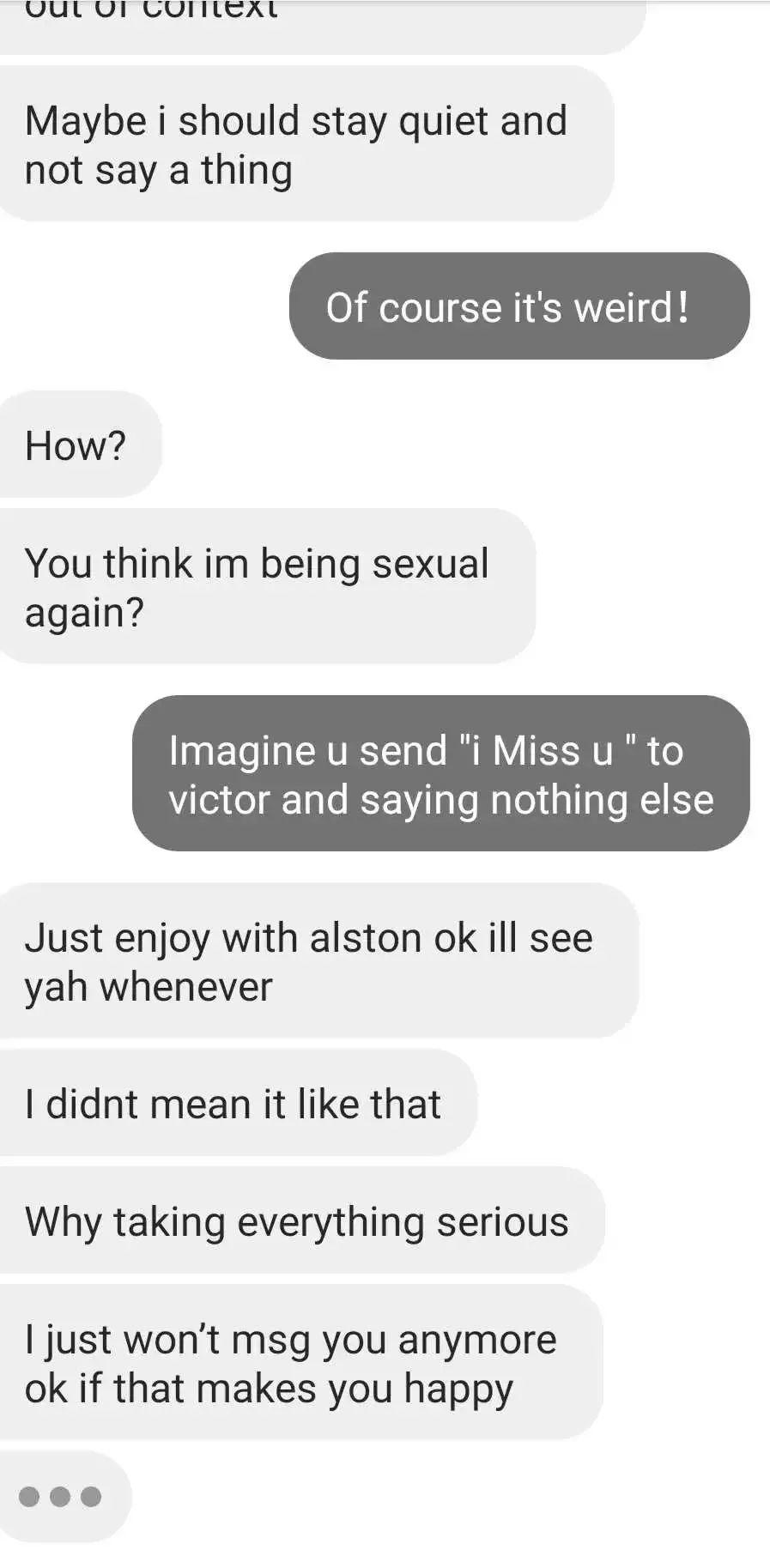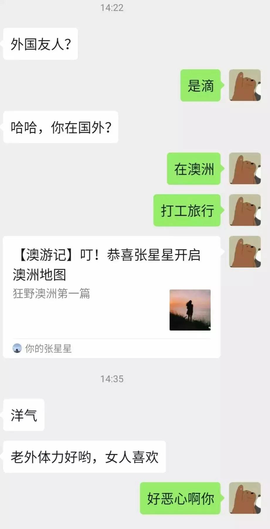 上周末,他连发了两张自拍,问“我看起来怎么样”。我一下子就炸了,不管是普通工友还是亲密工友,我都无法接受突然甩两张自恋自拍,我很委婉地问他这样是不是太sexual了,他发了一大段话告诉他只是想给我展示他的发型。