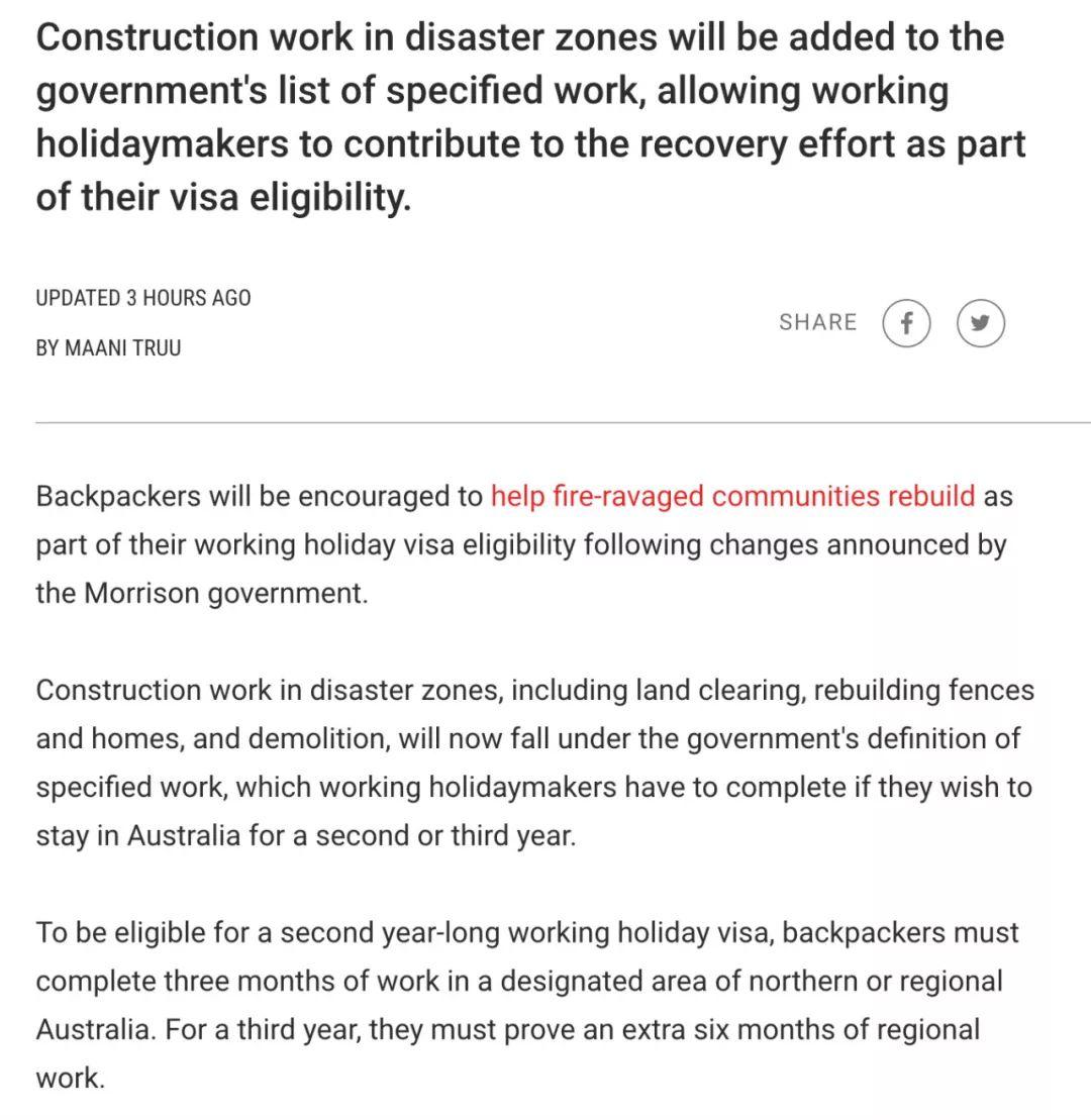 今日,代理移民部长ALAN TYDGE宣布:若包客在澳洲山火灾区参与重建工作,这些工作时间将可以计入集二签、三签所需时间内,且工作时间限制改为1年。”