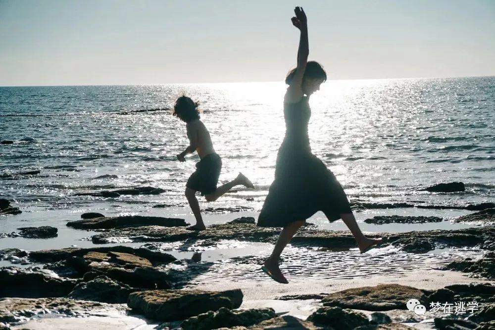 坐在面向海边的崖石和棕榈树下看红日沉入海底