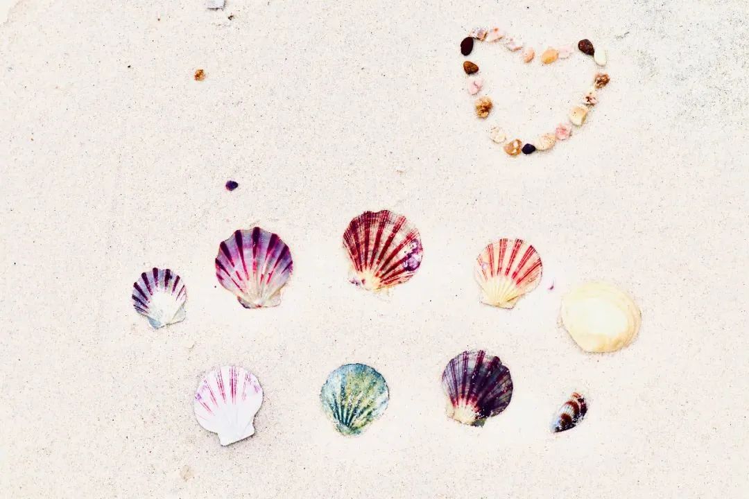 海滩上有很多颜色好看的贝壳和石头,感觉整个世界只有你和海鸥的存在