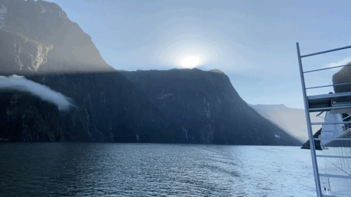 我最喜欢晴天时我们最早的那趟船,8点45分离开港口朝西北方向航行,行至途中,东方的太阳一点点被山体遮住,刺眼的光线慢慢消失,山体变成巨大的阴影,而更远一点的矮山仍沐浴在阳光之中,两者中间形成反差极大的明暗分界线,线是山的轮廓,清晰锐利,轮廓外,瀑布的水汽产生丁达尔效应,一束束光又显出层次。随着船的航行,不一会太阳又会再次从山间爬起,在前方继续描画轮廓和阴影。
