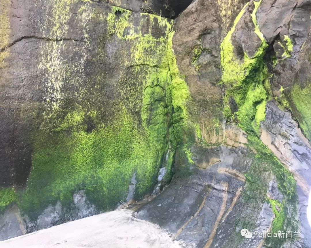 然后我们走下沙滩,一直往左走,看到了一面布满苔藓的璧山。