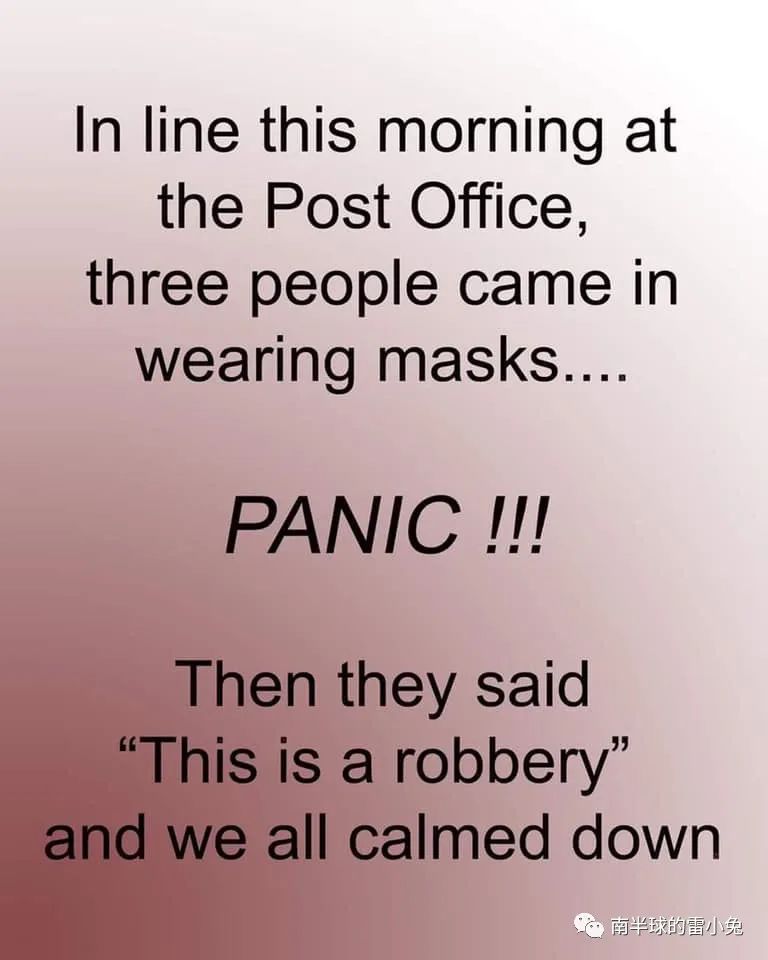 大意是一天早上在邮局,人们发现戴口罩的人,都感到异常惊恐,结果戴口罩的人回应说“我们是来抢劫的!”这时。。。大家才松一口气。。。