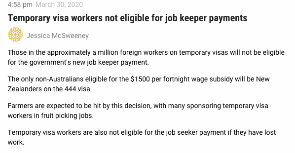 分享最近几个新闻: 有呼吁称政府应该为临时签证持有者提供补贴,帮助他们度过难关 失去工作或收入减少的临时签证持有者无法获得澳洲政府的补助 澳大利亚政府在疫情期间为雇员提供每两周1500澳元工资补贴 3月24日澳媒The Australian报道:随着COVID-19的全面经济和社会影响不断发展,开始考虑所有签证类别的保障措施。考虑留在我们澳洲境内的每个人,以确保所有人都有基本的安全保障,无论是公民、永久居民还是持有临时签证或过桥签证的人。 3月30日新闻:失去工作或收入减少的临时签证持有者无法获得澳洲政府的补助,如下图。 澳大利亚政府周一(3月30日)宣布1300亿经济刺激计划以确保劳动力市场度过疫情难关,失去30%以上收入的雇主所雇员工每两周可获得1500澳元的工资补助。但这项补助计划却没有涵盖临时签证持有者。 (来源:ABC中文网报道) (来源:今日悉尼) 澳大利亚联邦政府最近一共向市场投入了近3,200亿澳币刺激经济,我想告诉大家一个数据,2019年末,澳洲财政部长宣布联邦政府在13年来首次实现财政盈余71亿澳币,并预计在未来5年内(2024年时)实现450亿澳币的盈余。 澳洲财政一年才收入70亿,3200亿的收入需要45年,也就是说政府手上根本没有钱,政府是在向未来透支。 2019年政府通过了中低收入者的减税法,2019-2021年的每个财政年都将给予工作者1058澳币的减税。(我看要凉了) 可以预见的是,疫情过后,联邦政府可能会给所有在澳工作的人加税,不管你是PR、citizen、工签、留学生还是打工度假签,就算没领到这次的补贴,帮政府还债的事还是会算上你,无非多交点税呗。 补贴不给领,交税第一名。whv群体没有免税额,目前税点起征就是15%,赚1刀,交0.15刀给政府,留学生至少也有18200刀的免税额,whv真的毛都没。 世界疫情之下,失业、打工被骗、被黑心中介代理炒起几万一张的回国机票,房租吃喝样样付是目前大多数留澳的whver的真实写照,回国难,留在这更难。 最惨的一届whver,打工度假正在进入黑暗时代,这是最好的时代,也是最坏的时代。 至今澳洲政府也没有出台像新西兰一样的延迟签证政策,补贴也没有覆盖到,希望大家团结起来,下面有2个请愿活动,大家可以参与签个名,该争取还是要争取的。 请愿一、请求政府退税、减税 请愿链接: https://www.change.org/p/australian-taxation-office-support-for-backpackers-got-stuck-in-australia-reduce-tax-extend-visa-working-limits?recruiter=1067383276&utm_source=share_petition&utm_medium=copylink&utm_campaign=share_petition 请愿二、请求政府延长打工度假签的有效期 请愿链接: https://www.petitions.net/462417_working_holiday_visa_type_request_frozen_expiry_date_due_to_covid-19 即使没有欣喜的结果,也一度温暖过冷若冰霜的心灵。 不知道你们最近状况怎样? © 「莫克在澳洲」All Rights Reserved 相关文章 好消息!澳洲政府考虑给临时签证发放补贴和延长签证,whv包含在内! 新西兰WHV将无条件延长数月!澳洲WHV或紧随其后... 疫情