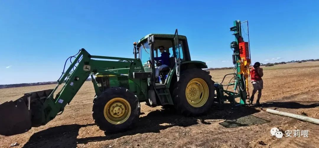 Damien在挖掘机后把木柱装上,然后就自动开始打桩。花了三个小时把一行木桩都打好,Damien就开车把一卷铁网铺在地上,然后我们把地上的铁网扶起来,Damien用一个类似订书机的装置把铁网钉到木桩上,钉好后一个新栅栏就修好了。