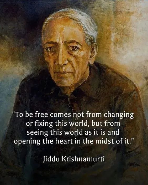 我们不停的向外寻找各种不同的答案,而这些所谓的答案,所谓的“自我”,都仅仅是意识形态的内容罢了,而我们的意识,我们的脑海往往都是充斥着冲突,矛盾的。 不管你如何去改变这个内容,也许做办公室职员对你来说,不是自己,于是你辞职变身画家,或许画画给你带来很多的成就,但是你依旧无法摆脱生活给你带来的其他痛苦,因为这些都无法解决问题的根源。 因为,你一直在分割着,将自我从这个世界分割开来,将意识和这个世界分割开来。 我们每个人一直都在寻找着人生意义,寻找着“我是谁”的答案,但是我们一直被束缚在“我”这样一个概念里,一直被束缚在”The known” 我们的思绪里,我们的意识里,我们失去了与他人,与自然,与整个宇宙的联系。