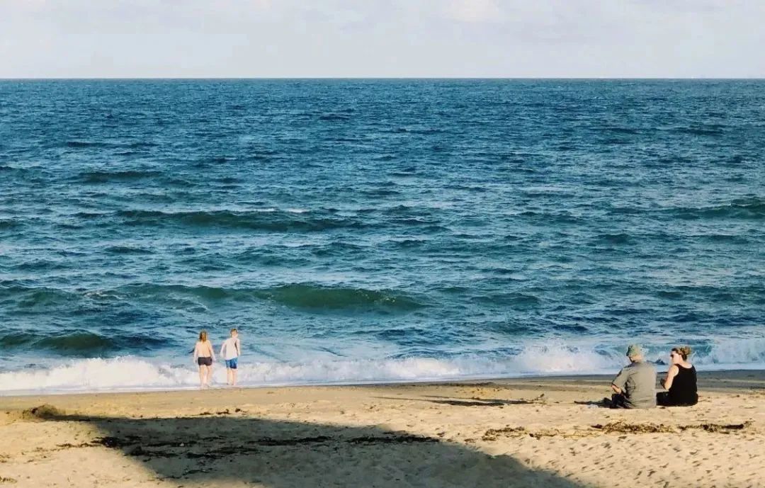 海滩附近很多大人带着小朋友在玩耍,他们打闹的声音打破了原本的安静,远处停泊着一排长长的运货轮船,距离把它们拉得很小很小一只,但是在夕阳的余晖下显得别样的耀眼,就像远方的一个航向标告诉你那边就是大海的方向。