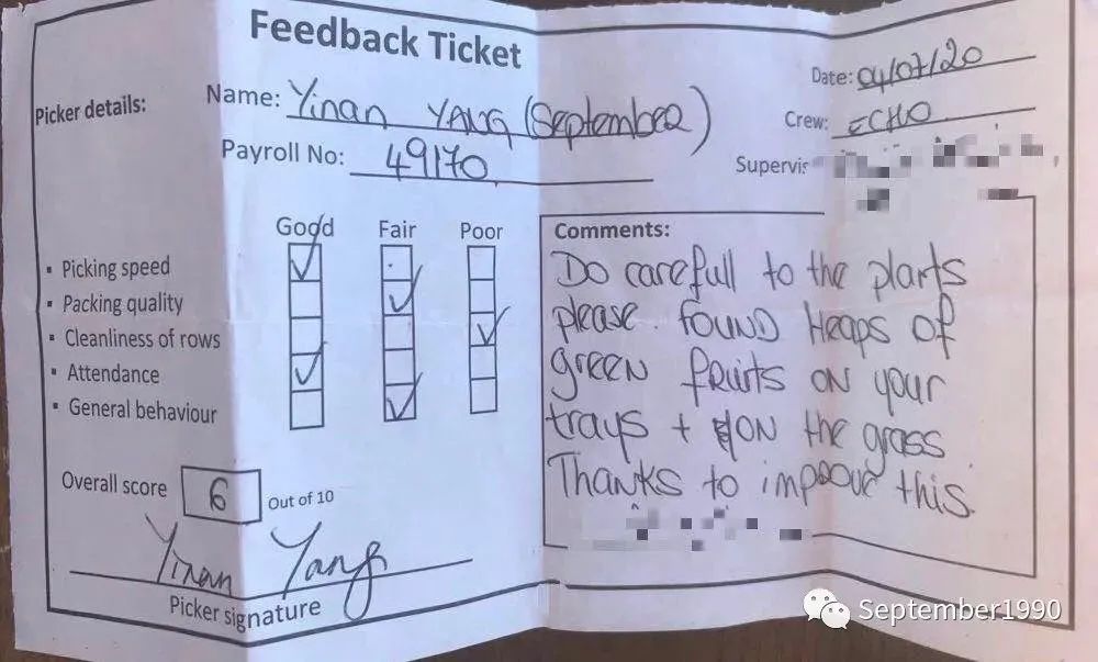如果你不按照她的要求来,解决方式也很简单粗暴,一两次warning后,下来就是bad feedback了,集满三张就要走人(其他组有说法称只是让暂时离开Costa)。如果跟她申诉,她会用同一套说辞对付所有人,查果是她的工作、她会保证公平、谁摘得不好跟她说等。哪怕你交的果已经很干净,哪怕让你跟新手一样慢慢摘果、交远低于6公斤限制的重量,你也得听她的。