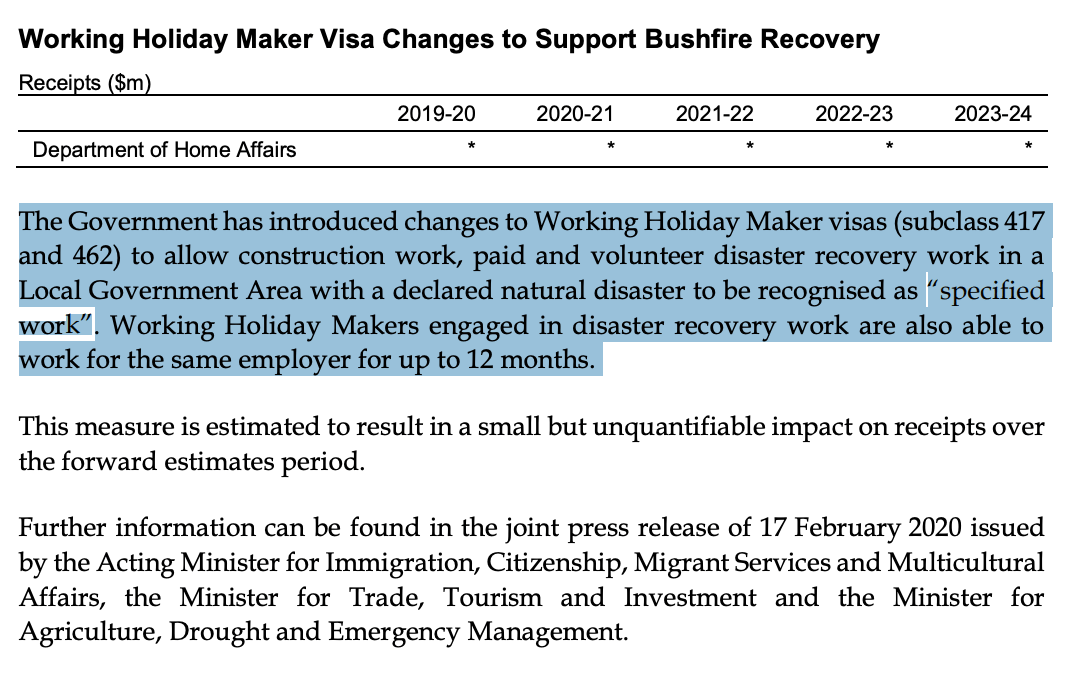 目前在食品加工或农业相关工作的打工度假者(417和462类)签证持有人将有资格获得签证延长(也有可能是个新的visa,原文是 a further visa,所以可能是个新签证也可能是原签证基础上延长),并且免除为一位雇主工作不能超过六个月的限制。